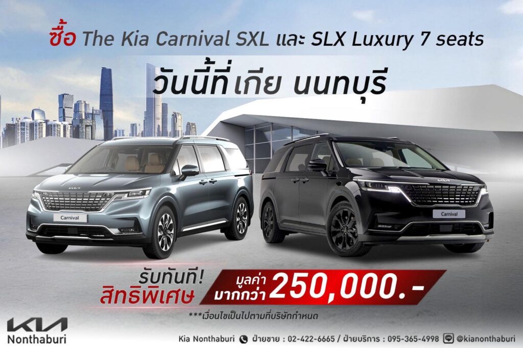 ซื้อ Kia Carnival SXL หรือ SLX Luxury 7 ที่นั่ง วันนี้ที่ เกีย นนทบุรี รับทันที! สิทธิพิเศษมูลค่ากว่า 250,000 บาท!!